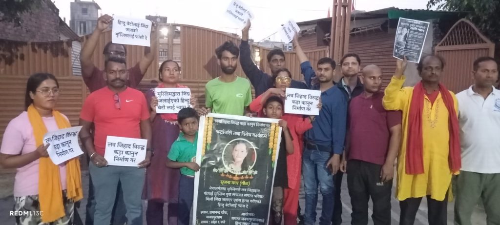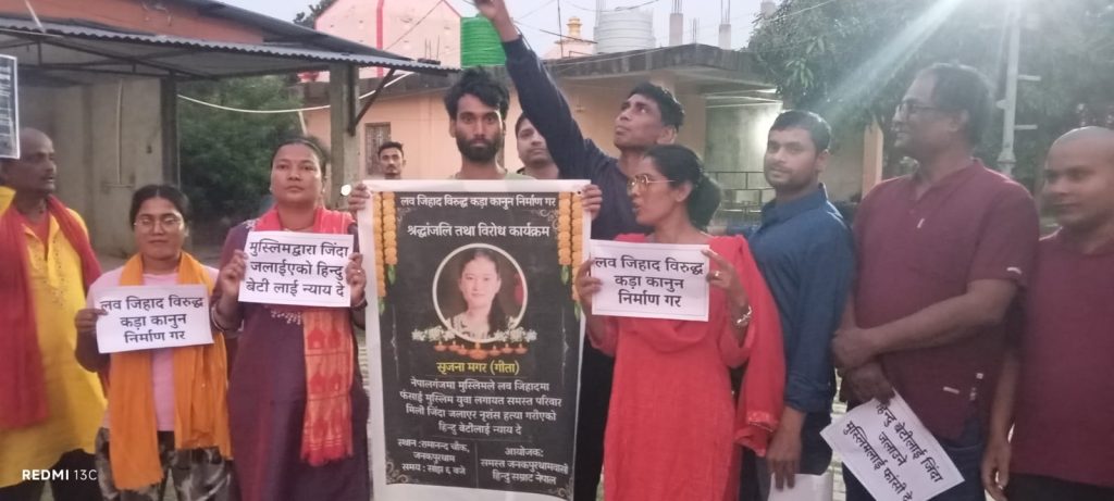 नेपालगञ्जमा एक हिन्दू युवतीलाई जिउँदै जलाइएको दर्दनाक घटनाको विरोधमा आज बेलुका जनकपुरधामको रामानन्द चोकमा शान्तिपूर्ण विरोध प्रदर्शन तथा श्रद्धाञ्जली कार्यक्रम सम्पन्न गरिएको छ।